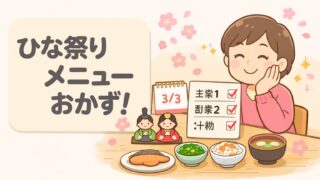 ひな祭りメニューのおかずは「主菜1+副菜2+汁物」の型で迷わず決まります。ちらし寿司に合う主菜・彩り副菜・定番汁物の選び方と、当日30分で回す時短段取りを紹介。